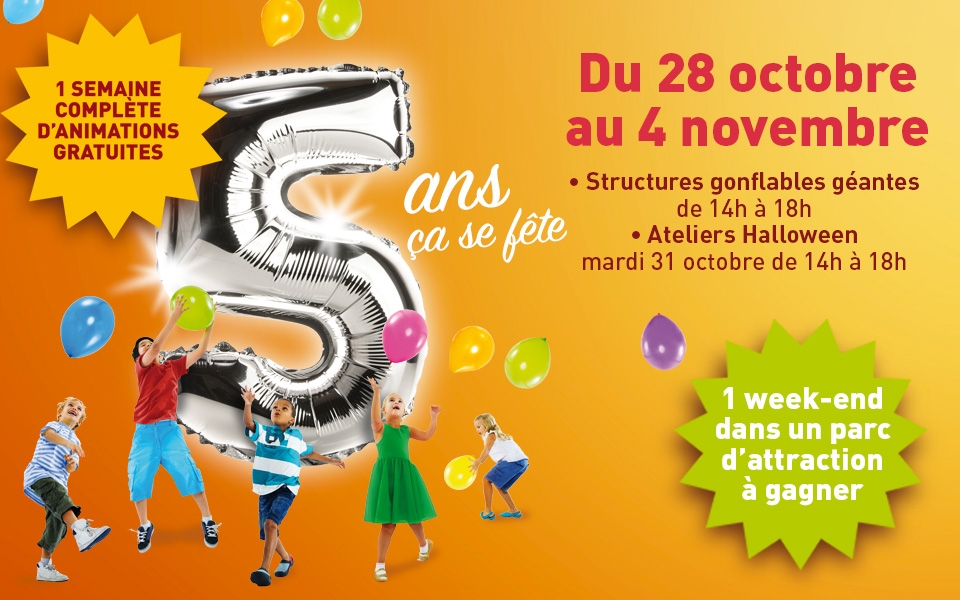 Votre centre commercial Les Cyprès vous propose de venir fêter ses 5 ans en famille du 28 octobre au 4 novembre.