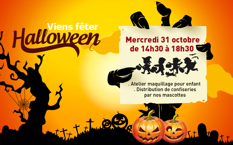 Mercredi 31 octobre vient fêter Halloween au centre commercial les Cyprès à Saint-Aunès ! Au programme, de 14h30 à 18h30, atelier maquillage gratuit pour enfant et distribution de confiseries par nos mascottes. N’hésite pas à venir déguisé ! A mercredi !