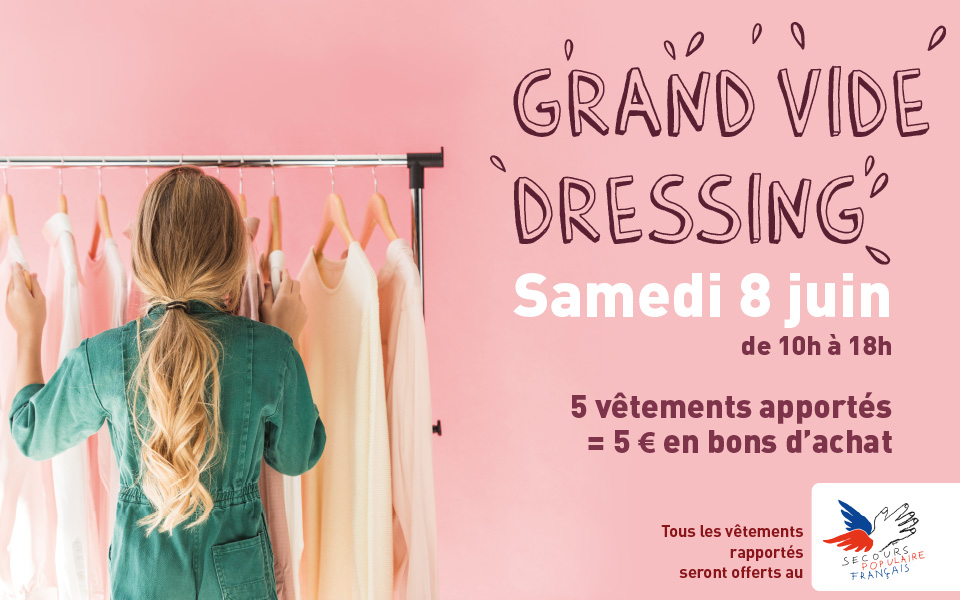 Votre centre commercial Les Cyprès à Saint-Aunès organise le samedi 8 juin de 10h à 18h une opération vide dressing en partenariat avec le Secours Populaire. Un geste simple et solidaire : déposez 5 vêtements (adulte ou enfant) en bon état à nos hôtesses et recevez en échange un bon d’achat de 5 euros* à valoir dans l’enseigne de votre choix. (*) Bon d’achat de 5 euros valable dans la boutique de votre choix pour tout achat d’un montant de 30 euros minimum effectué sur la période du 08 au 15/06/2019. Ce bon d’achat ne sera valable qu’une seule fois et sur un seul et même ticket de caisse sur présentation du bon original en caisse. Ni échangeable, ni fractionnable, ni remboursable. Un bon d’achat par personne en échange de 5 vêtements, dans la limite du stock disponible.